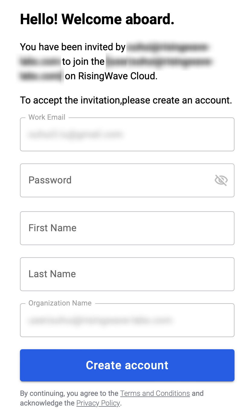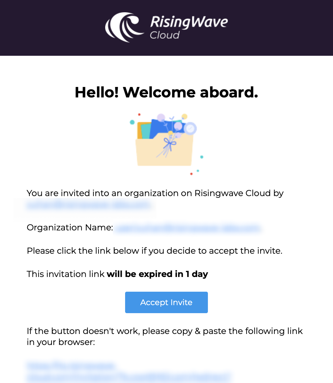 After the organization owner sends the invitation, the invited user should receive an email. Click Accept Invite within one day and fill in your information and account password to sign up for RisingWave Cloud and join the organization. After you join an organization, you’ll have full access to the resources and database objects in the organization. You can also invite others to join the organization.![]() | ![]() |