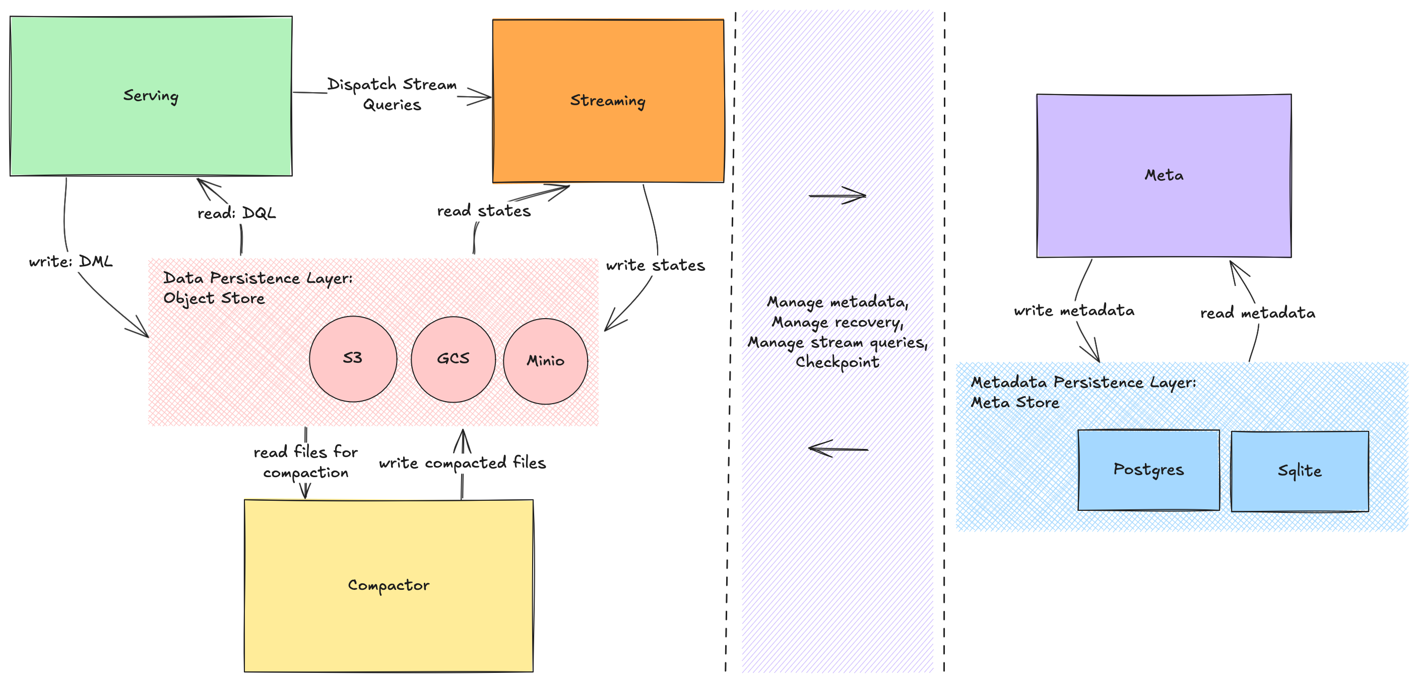 - For recovery and compaction: the meta node recreates actors on the compute node, starting from the last checkpoint snapshot to maintain consistency. The meta node manages compaction by generating compaction tasks, assigning them to compaction nodes, and updating the meta store’s metadata upon task completion.