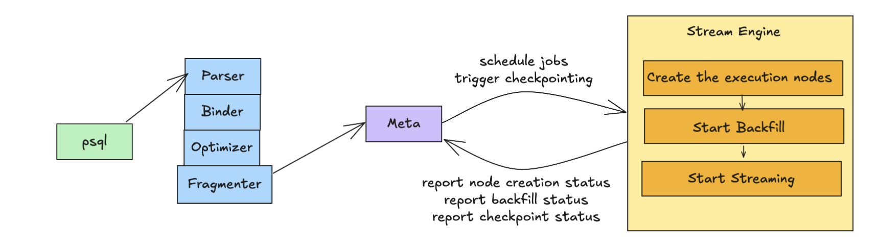 Once the execution nodes are built, we trigger historical data backfilling to ensure consistency with upstream sources. After backfilling completes, the streaming job will be created to continuously process upstream data, materialize updates, and propagate the transformed data stream to any downstream systems. See An overview of the RisingWave streaming engine for more information.